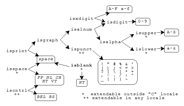 The character classification functions are strongly interrelated. Many are defined in terms of other functions. For characters in the basic C character set, here are the dependencies between these functions: