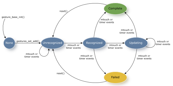 State transitions are specific to the gesture that the recognizer is detecting. Most state transitions are a result of mtouch or timer events that are of interest to the gesture recognizer.