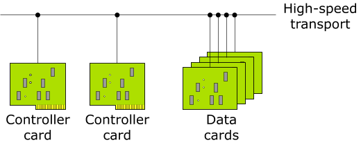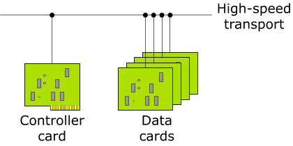 This configuration has asymmetric transport: a High-Speed Transport (HST) and a reliable and economical Low-Speed Transport (LST). You might use the HST for user data, and the LST exclusively for out-of-band control (which can be very helpful for diagnosis and during booting). For example, if you use generic Ethernet as the LST, you could use a DHCP ROM on the data cards to economically boot—no flash would be required on the data cards.